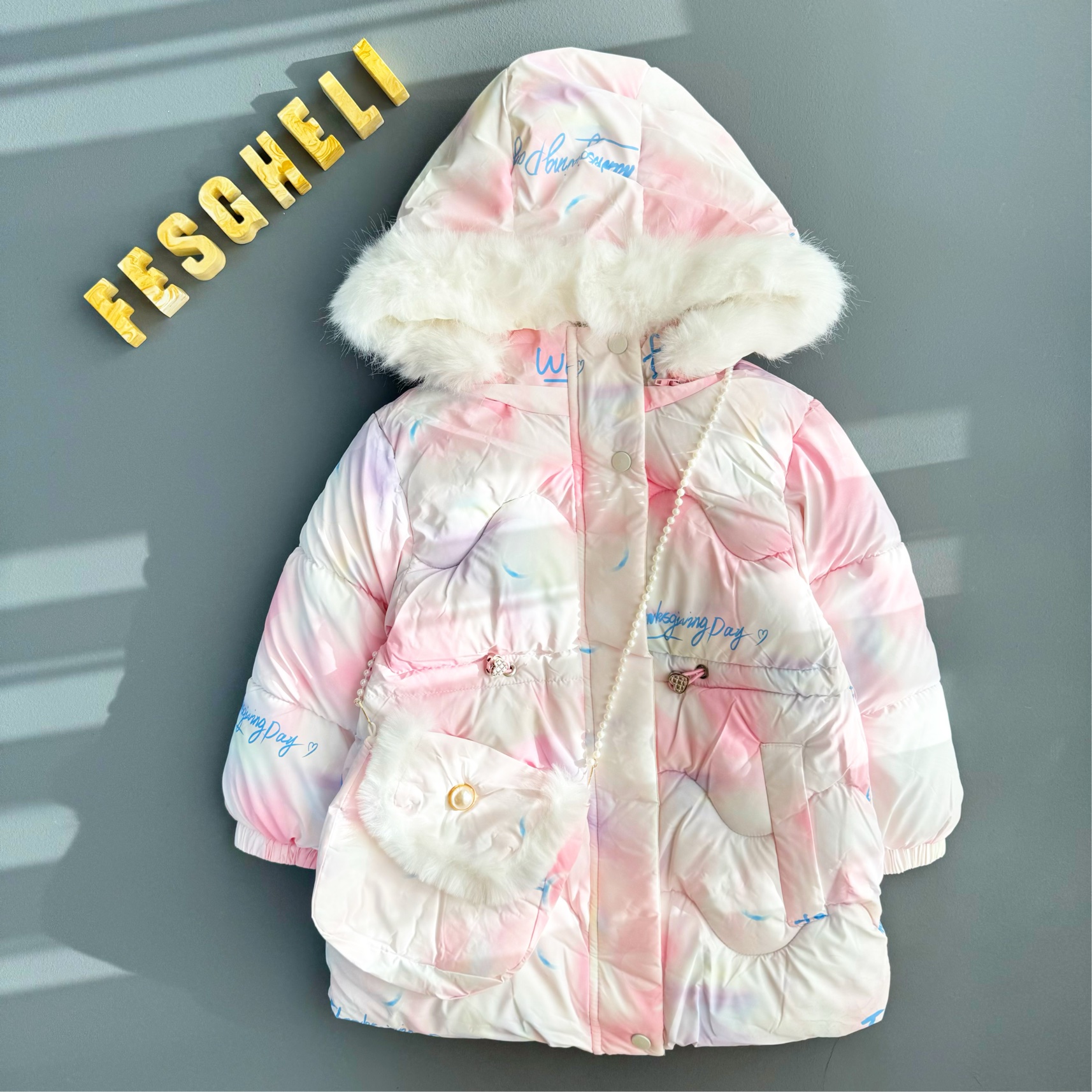 ناموجودکاپشن دخترانه وارداتی داخل مخمل جنس رویه ضد آب و باد طرح فرشته صورتی کد 217